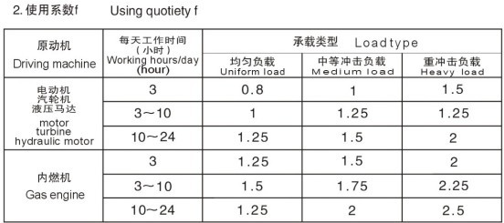式中P1N為選型功率,P1為實際需要的功率,f為使用系數(shù),PN為許用功率。